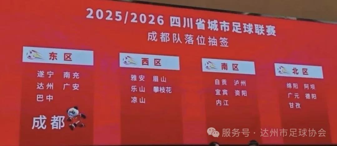 现场,备受关注的成都队经过抽签落位东区,这意味着,“川超”各赛区的球队全部落位。据了解,各市(州)按地理位置相邻分为东、西、南、北4个赛区,东区包括遂宁、南充、达州、广安、巴中、成都6队,西区包括雅安、眉山、乐山、攀枝花、凉山5队,南区包括自贡、泸州、宜宾、资阳、内江5队,北区包括绵阳、阿坝、广元、德阳、甘孜5队。