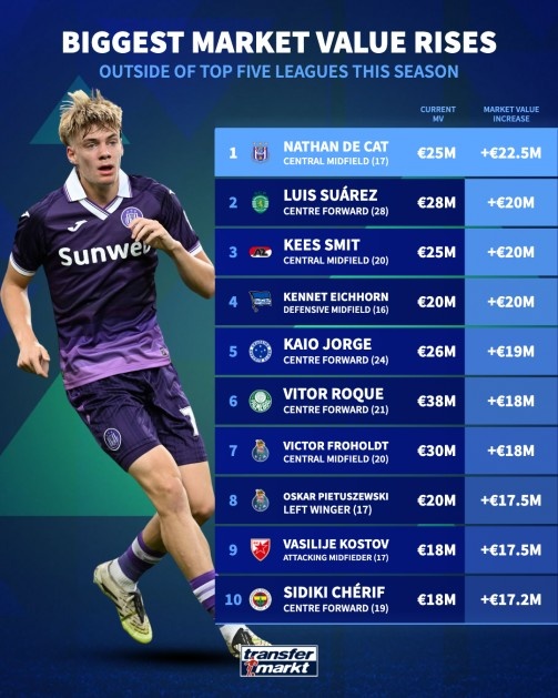 1、德卡特(安德莱赫特,17岁,2500万欧):+2250万欧