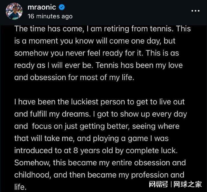 每天三分钟,知晓天下网球事。球迷朋友大家好,今天是2026年1月12日星期一。欢迎收听收看由《网球之家》为您提供的新闻午报。北京时间今晨,加拿大名将米洛斯-拉奥尼奇在个人社交媒体上发文,宣布结束自己的网球生涯正式退役。35岁的拉奥尼奇有“加拿大火炮”、“拉神”之称,曾在2016年打进温网决...